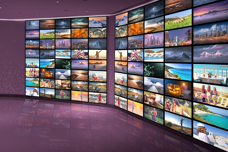 A video wall is a large-scale display that can be used for a variety of applications including public information, advertising, entertainment, security control rooms and more. A video wall system can deliver performance, flexibility, and interactivity that far exceeds a more basic video solution. This is because a video wall system is actually an integrated array of multiple high-resolution displays, controlled by a powerful processing system. The total resolution of the display surface actually increases with each display added to the array, so a video wall can have a much larger display area and much higher resolution than a single display or projector. Video walls can be touch-sensitive and interactive if desired.